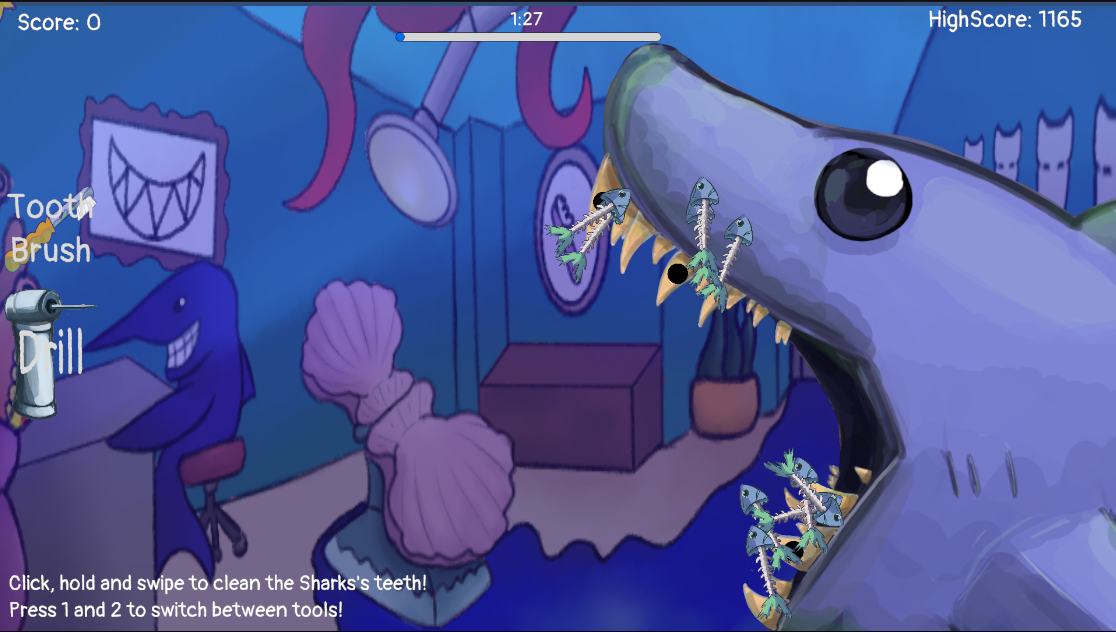 Teeth Cleaning: Number pad and mouse for movement, click, hold, and move to brush teeth, click to remove fish, click and hold to remove holes